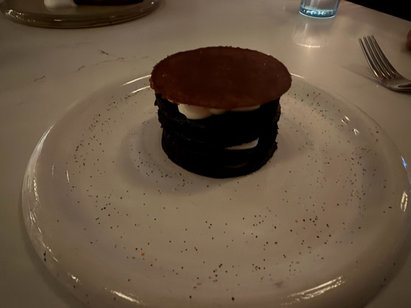 Chocolate Cake (8/10): A delightful, fresh, and light dish composed of small, fluffy chocolate disks layered with white chocolate ganache. Topped with a thin caramel crisp disk.