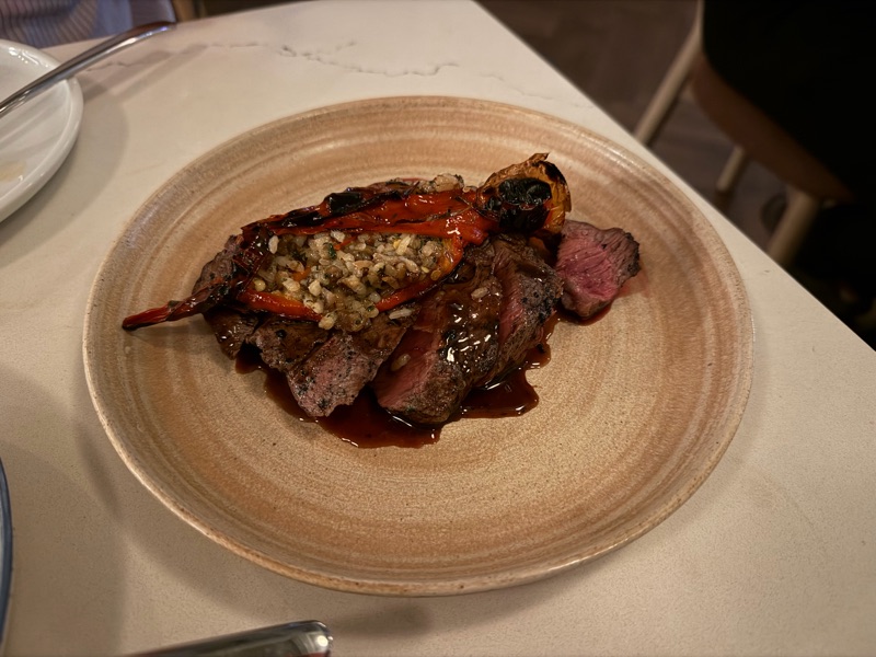 The steak accompanied by jus, had a nice flavour, but it was served medium rare. The accompanying side of manganji pepper stuffed with rice was okay, but the steak itself was the main issue. It would be extremely helpful if the staff would proactively mention the kitchen's preferred serving temperature for the steak when the order is placed, allowing guests to adjust if they prefer a different doneness.
