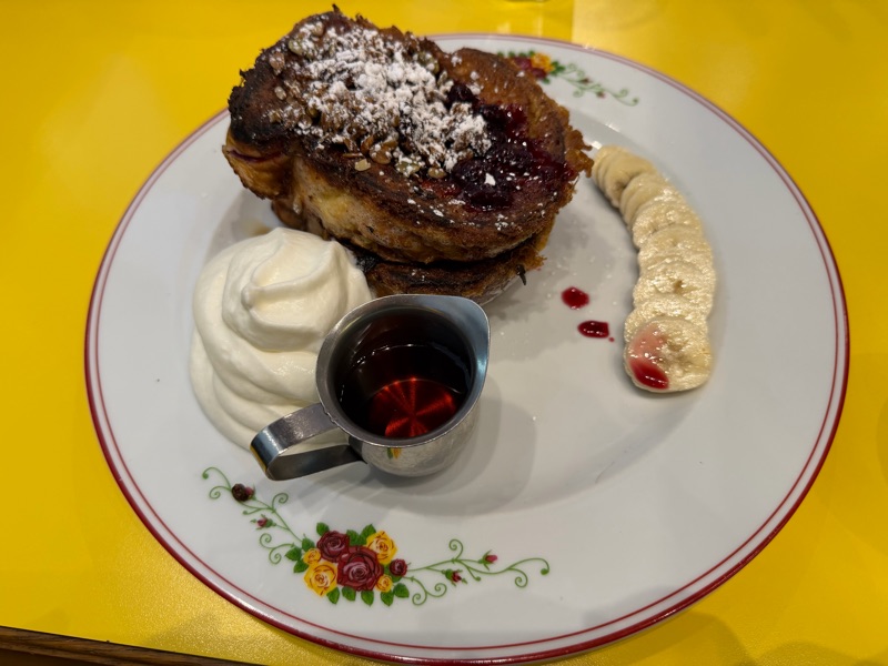 The presentation was lovely, and the French toast itself was tasty, well-complemented by the addition of granola, cinnamon, berry coulis, banana, whipped cream, and maple syrup. My only critique is that the texture could have been improved by letting the challah soak in the egg mixture a bit longer to ensure it was evenly moist throughout. Overall, it was a very satisfying dish.