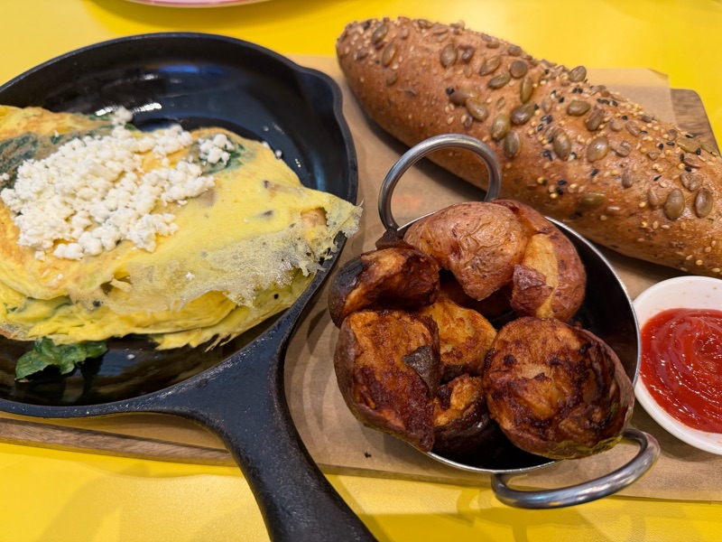 which included portobello mushroom, spinach, and leek with goat cheese, served alongside crushed potatoes and multigrain bread. He thoroughly enjoyed his meal, specifically praising the crushed potatoes as a highlight.