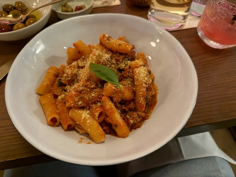 For my main course, I chose the Rigatoni Bolognese with plant-based ragu and almond Parmesan. The ragu was truly the star—so rich and full of flavour that I honestly wouldn't have known it was a vegan dish if I hadn't been told. It was light and well-made overall. My only minor note is that the pasta itself was slightly tougher than my personal preference, but the incredible taste of the ragu easily made up for it (8/10).