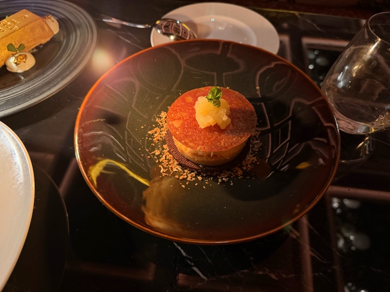 Visually stunning. The combination of coconut rum Panna Cotta, pastry cream, cocoa sable, and a pineapple-like gel was smooth and velvety with amazing, sweet flavours. For some reason, I tasted Tonka bean in the profile, though I wasn't 100% sure. Overall, it was sweet and delicious.