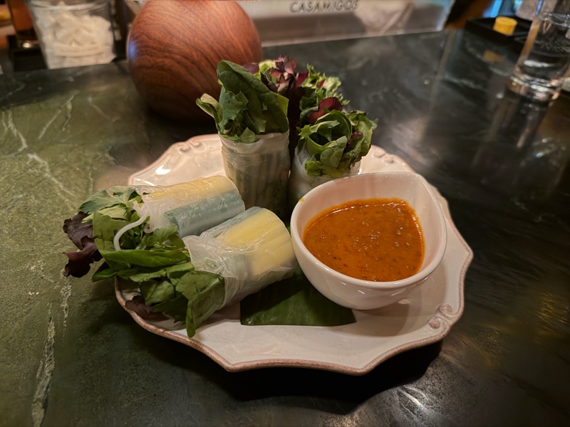 These rolls, featuring mango, mint, cilantro, cucumber, red pepper, vermicelli, and a beautiful peanut sauce, didn't quite meet expectations. While the raw vegetables were perfectly fresh, the use of mixed greens was overkill; switching to delicate micro greens would significantly refine the texture. Furthermore, the presentation could be elevated with a more thoughtful, artistic plating arrangement. That said, the accompanying peanut sauce was outstanding—aromatic and softly spiced.