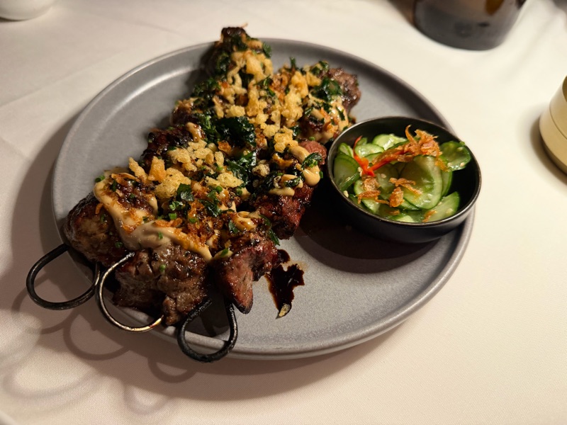 The charcoal grilled marinated beef skewers were super tender and delicious. Jacintha's suggestion to add an extra skewer for sharing was appreciated. The side cucumber salad had a nice sesame oil and mirin flavour. The meat pieces were well marinated. One suggestion: the meat pieces were disproportionately large, making the dish feel closer to a main course than an appetizer. Smaller pieces would enhance the dish.